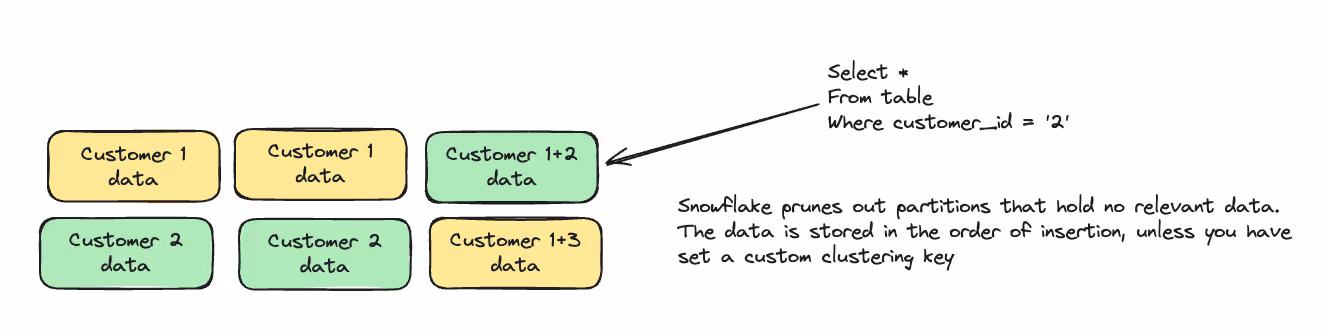 Snowflake doesn’t support indexing - instead, it’s up to the query to make sure you don’t go over too much data. If, for example, you copy data customer by customer, and you don’t specify a customer filter in your query - it might need to scan the entire table. Which is exactly what happened to us.We had some views with inner CTEs (See: https://docs.snowflake.com/en/user-guide/queries-cte), that didn’t have customer filter, which was only filtered down the road.Thus, those inner queries had to scan the entire table, only to filter out these values at a later stage. We had no way to filter out those inner values from outside, as it was a different customer for each query. So we replaced those views with UDFs (https://docs.snowflake.com/en/developer-guide/udf/udf-overview), that allowed us to pass the customer as a parameter to those inner CTEs. Each query now ran only on it’s relevant data. See the following example: